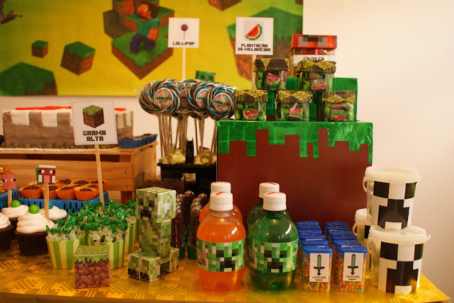 Vinicius escolheu o tema para sua festa de aniversário de 8 anos. E nós do Gaaya fomos atrás de conhecimento para entendermos sobre um jogo chamado Minecraft. O universo do Minecraft é formado por imagens "distorcidas", ou seja, como se o conjunto de pixels que formam as imagens digitais não tivessem uma boa resolução. Outra coisa que observamos foi o uso das cores. O marrom e o verde se destacam. Mas o laranja, o azul, o vermelho e o dourado também estão presente. São muitos detalhes. Existe também as comidinhas específicas e até um bolo igual ao que fizemos para o Vinicius. Depois de compreendermos melhor o jogo e seus personagens partimos para o processo de criação da a arte gráfica. Tivemos apenas uma semana para montarmos essa festinha. Então, nem preciso dizer que foi uma correria pra deixar tudo pronto. Mas ver a carinha de felicidade do Vinicius foi a coisa mais gostosa do nosso sábado.